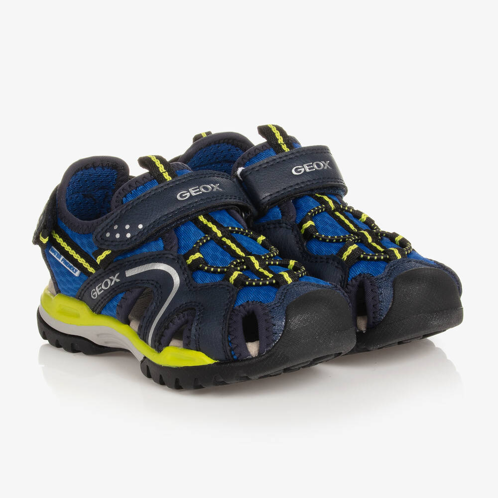Navy blue mesh and faux leather sandals for boys by Geox with neon yellow details. These lightweight sandals have a breathable, antishock and antibacterial inner sole for added comfort and durability. Suitable for use in salt and fresh water, the non-slip rubber outer soles improve grip underfoot. Two velcro fastening straps ensure a secure fit as well as easy dressing.