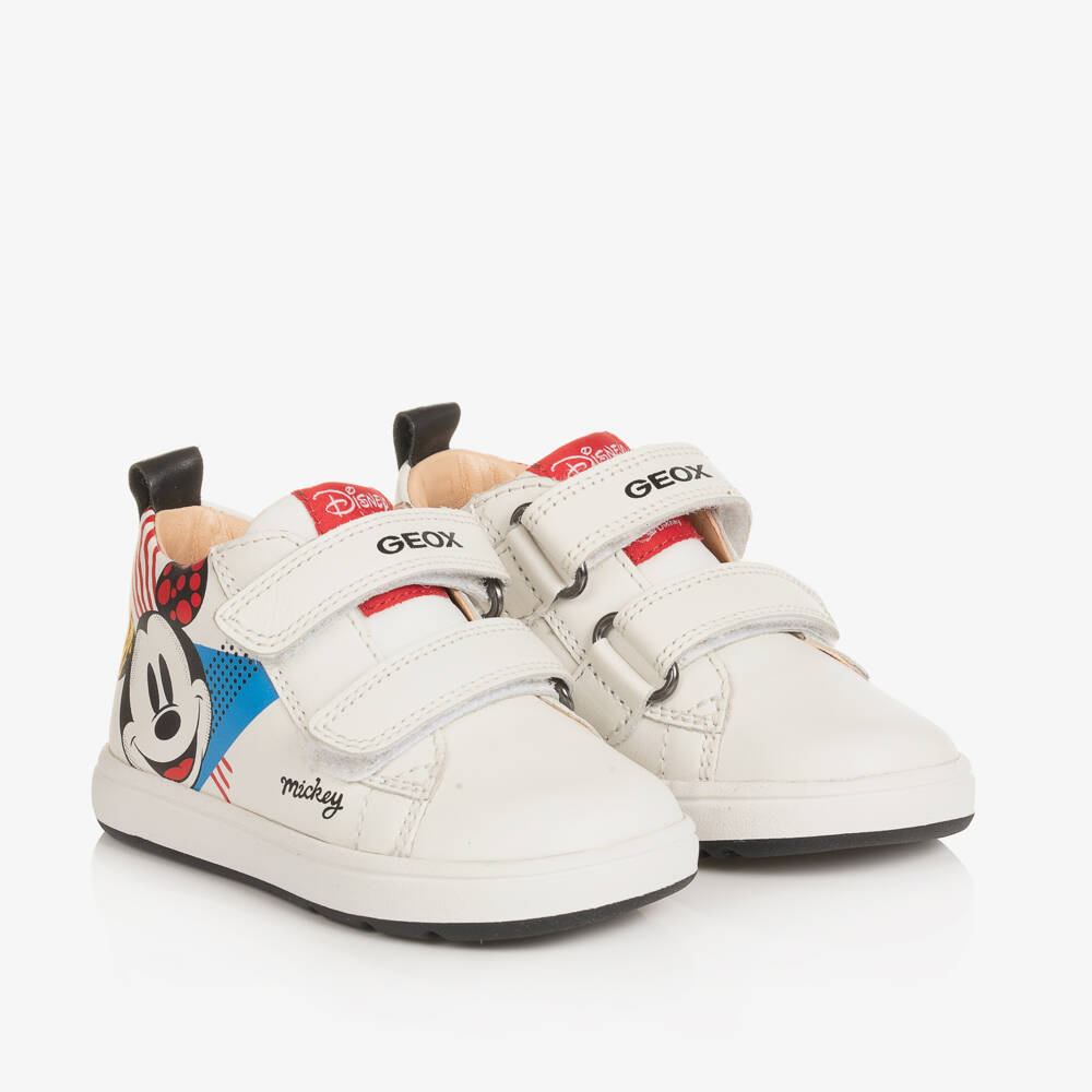 White leather trainers for little boys by Geox, with a fun Mickey Mouse design printed on the side and a branded Disney patch on the front. Made with a padded, mesh antibacterial insole and non-slip rubber outer soles, these shoes are super cute and comfortable. They have useful front velcro straps for easy fastening.