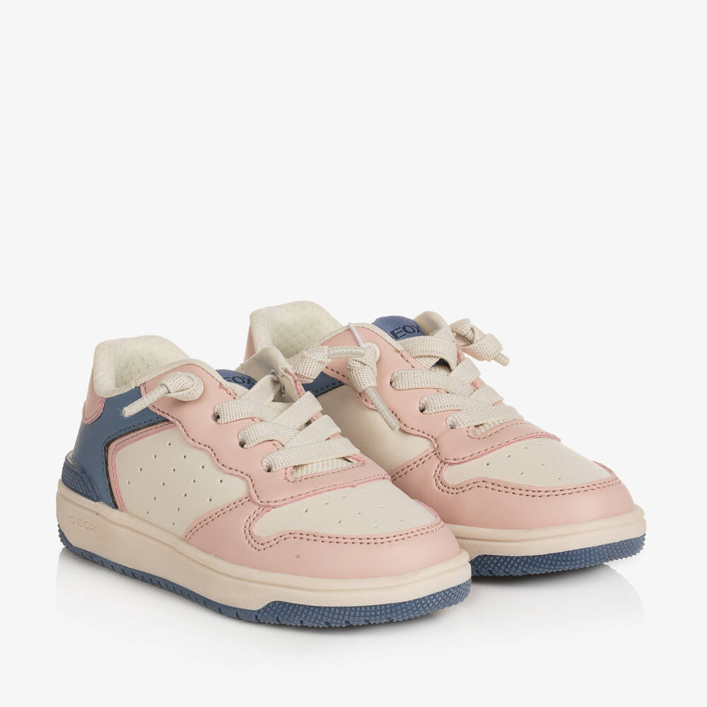 In ivory with pink and blue trims, these faux leather trainers for girls are by Geox. Providing optimum comfort, the mesh lining is breathable and antibacterial, and the textile insole is shock absorbing. The non-marking rubber sole has a perforated waterproof membrane, which prevents water from penetrating, whilst still being breathable. There are elasticated laces for easy pull-on, with durable heel and toe protection, and subtle logo branding.