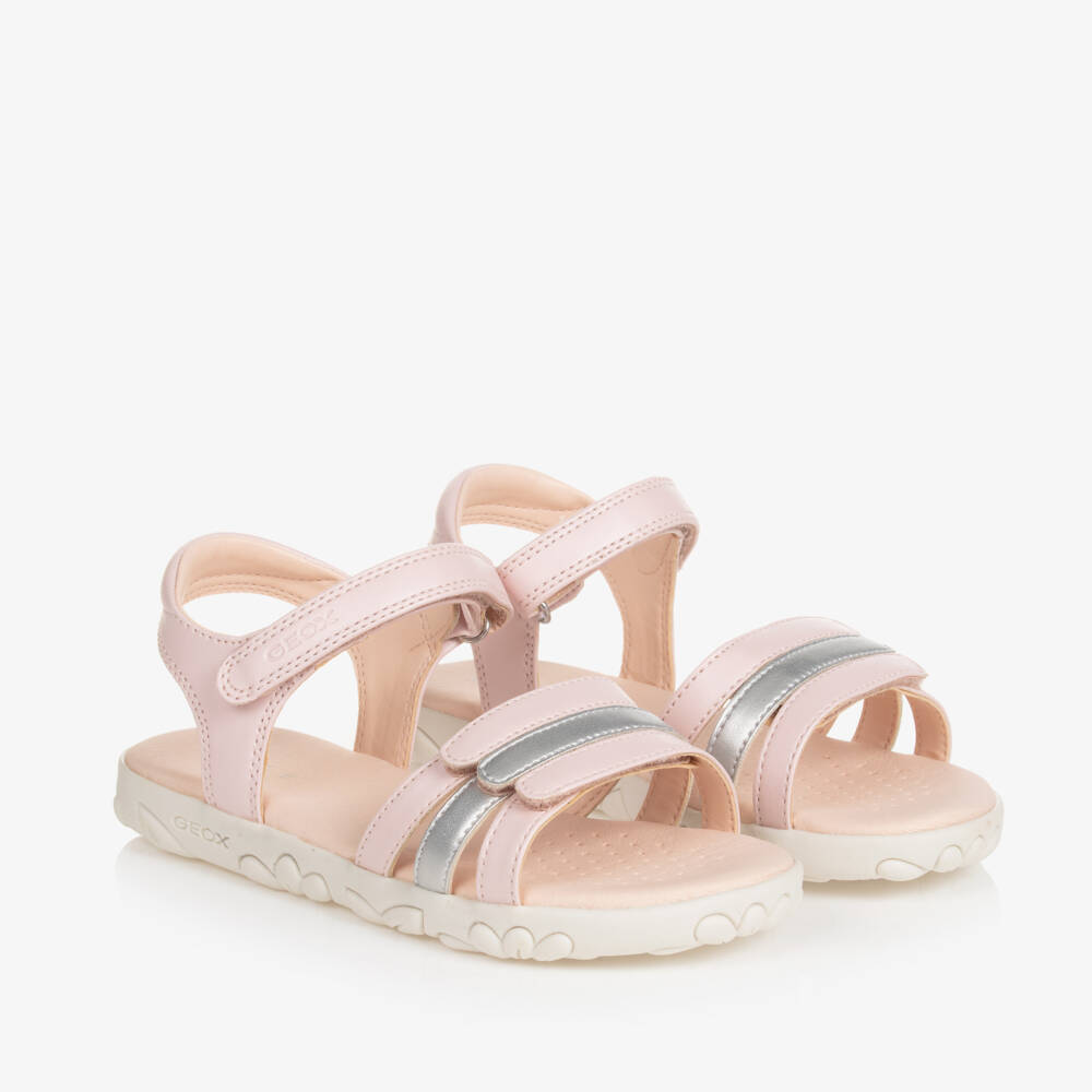 Pretty pink and silver sandals for girls by Geox, made in soft faux leather. Cute and practical, they fasten with simple velcro straps on the top of each foot. The soft, foamy insoles are perforated for improved breathability, and the rubber outer soles are embossed with sweet flowers to create a non-slip finish.