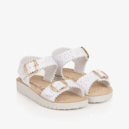 Girls white faux leather sandals by Geox, designed with two adjustable buckle fastening straps. For lasting comfort, they have a soft textile lining and a shock-absorbing, cushioned insole. The ridged rubber outer sole has a perforated, waterproof membrane to help keep feet comfortable and dry, whilst providing good grip on slippery surfaces.