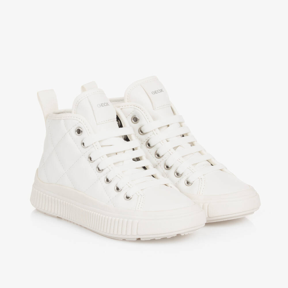 White high top trainers for girls by Geox, made in smooth faux leather in a stylish quilted design. Lined in soft textile with a removable insole that is antibacterial and anti-shock, they fasten with laces and an easy side zip. The non-slip rubber soles feature the brand's signature Respira perforated membrane, making the shoes both waterproof and breathable.