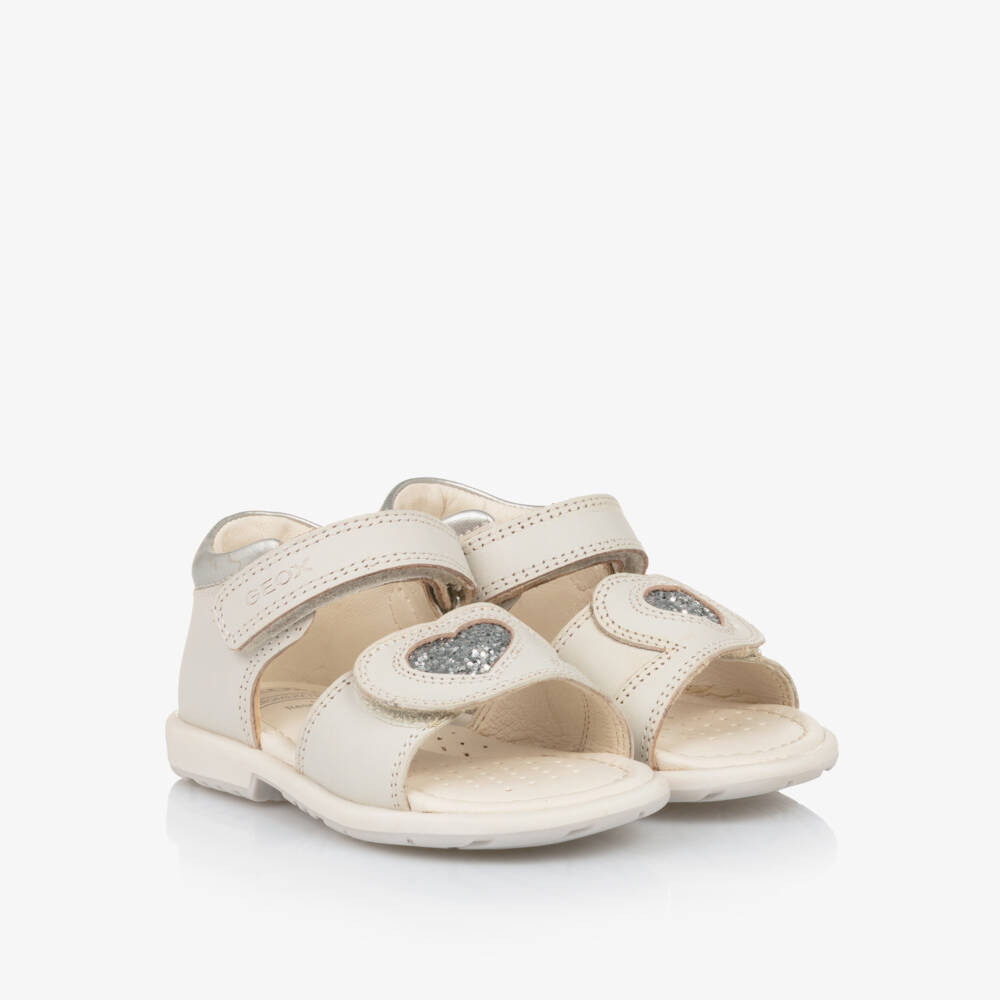 White & silver sandals for little girls by Geox, featuring a charming glittery heart on the front. Made in a blend of leather and synthetic material, these sandals offer durability and comfort. They fasten easily with a velcro strap and the cushioned chromium-free leather insole provides a gentle touch. The flexible non-slip rubber soles are perforated and have a waterproof membrane, allowing little feet to breathe whilst keeping them dry.