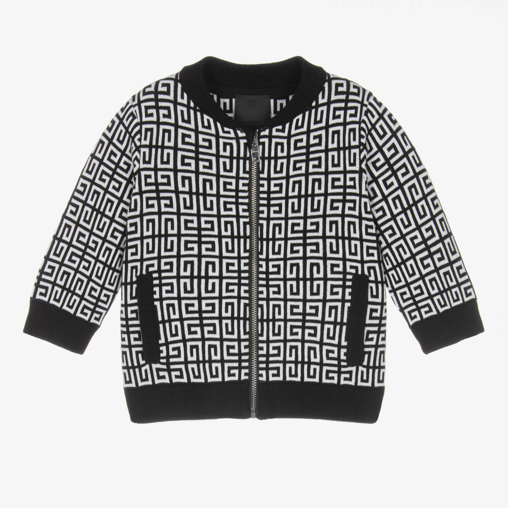 From French label Givenchy, a black and white Mini-me zip-up top for baby boys. A luxurious stand-out piece, the soft cotton fabric is detailed with intricately knitted 4G jacquard motifs. Amongst the pattern on the back is an intarsia logo in bold white. Ribbed trims add warmth and the is a logo-engraved zip pull on the front for extra designer details.