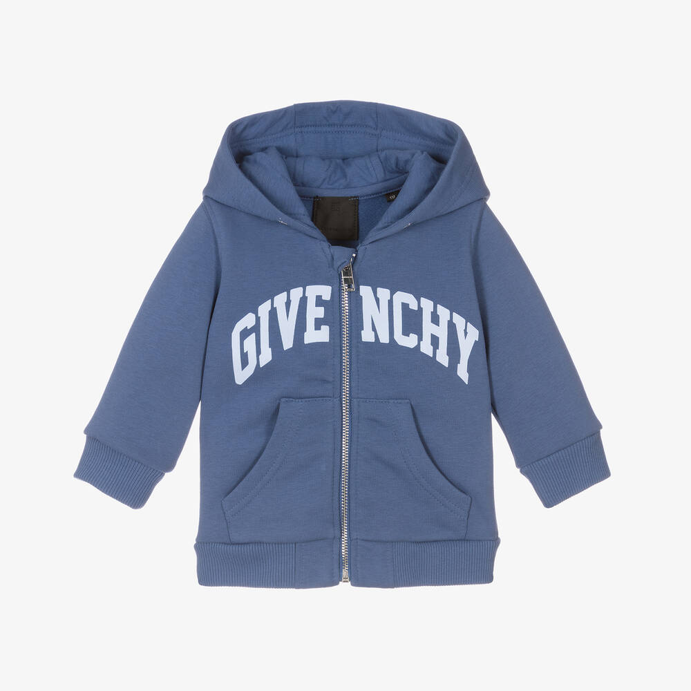 Blue zip-up hooded top for baby boys by luxury French brand Givenchy, made in soft, mid-weight cotton jersey with a warm fleecy inside. Cosy and casual, it has ribbed trims and patch pockets on the front. There is a classic pale blue logo printed across the chest and the brand's iconic 4G logo on the back. Ideal for layering, it fastens easily with a shiny silver zip.