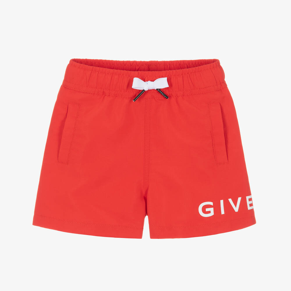 Red swim shorts for baby boys by luxury French brand Givenchy. Soft and smooth, they have a white logo print around one leg and the designer's signature 4G logo printed in white on the back pocket. There are front pockets and a useful drawstring waist.