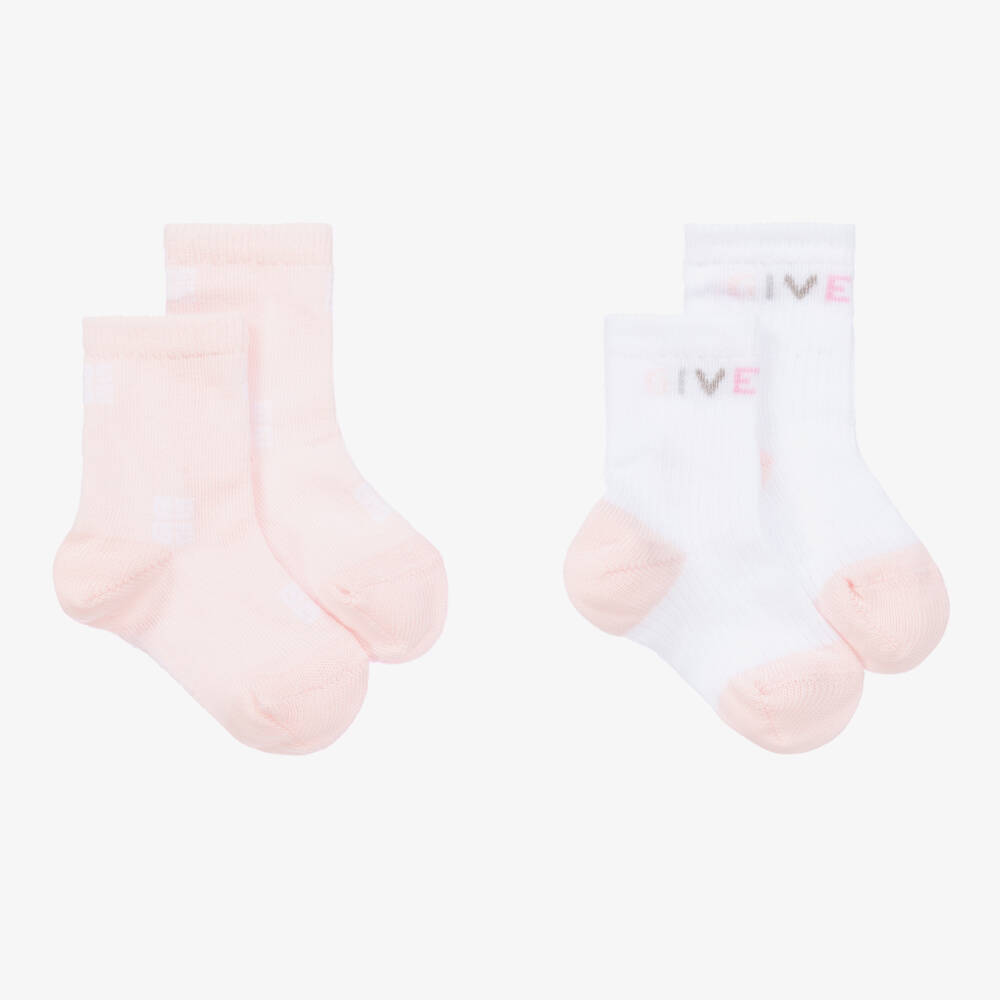 Two pairs of pink and white ankle socks for baby girls from luxury designer Givenchy, made in a super-soft cotton blend. The white pair are designed with jacquard branding across the front in complementary tones of pink and grey. 4G logos can be found on the pink pair for instant designer recognition. A lovely gift, they are presented in a branded box.