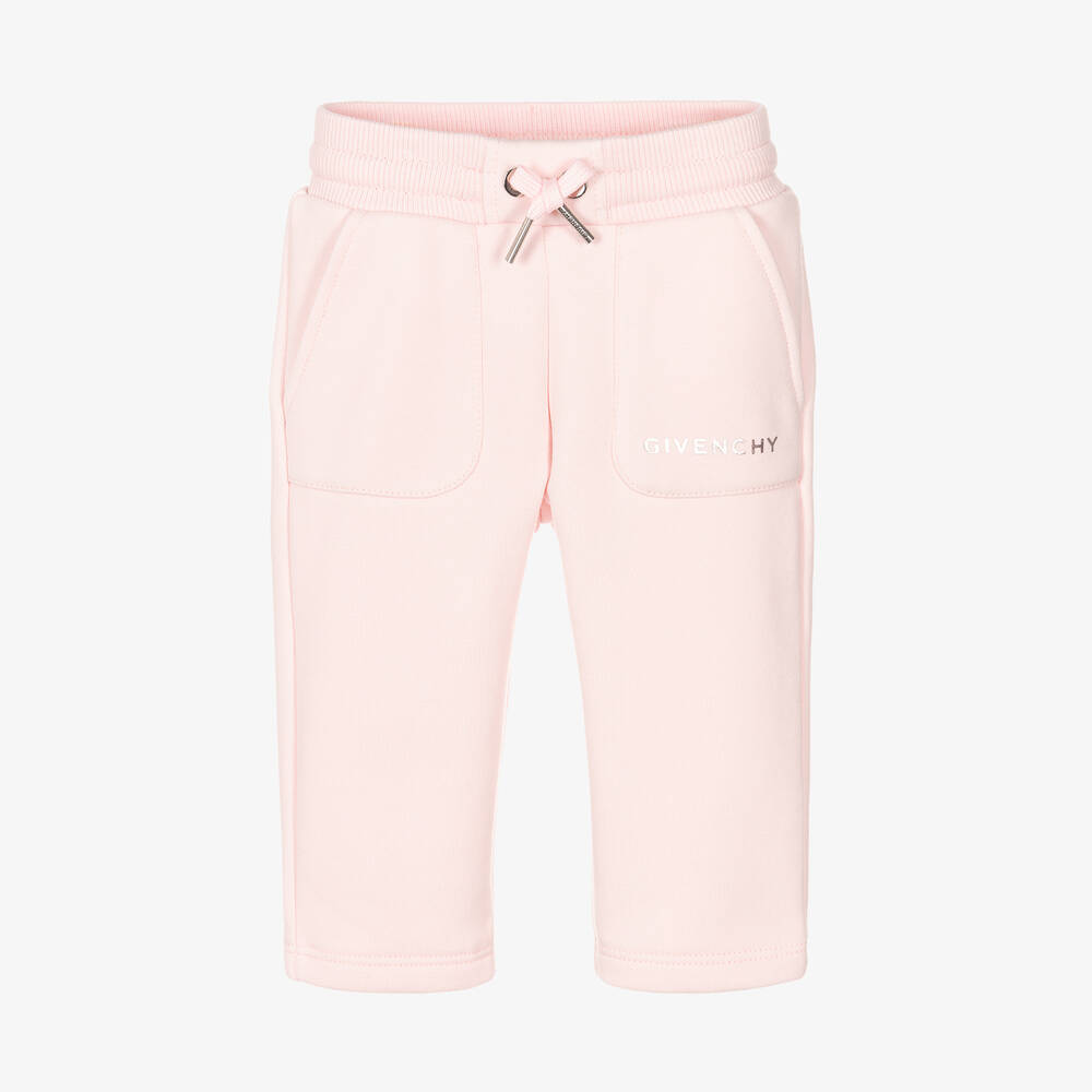 In a pretty shade of pale pink, these joggers for baby girls are by luxury brand Givenchy. Made from soft cotton-blend jersey, they have a cosy fleecy interior and useful pockets on the front. A metallic silver spell-out logo is printed on one side with a 4G logo on the back for an iconic finish. Completing the casual style, they have a ribbed, elasticated drawstring waist for an adjustable fit.
