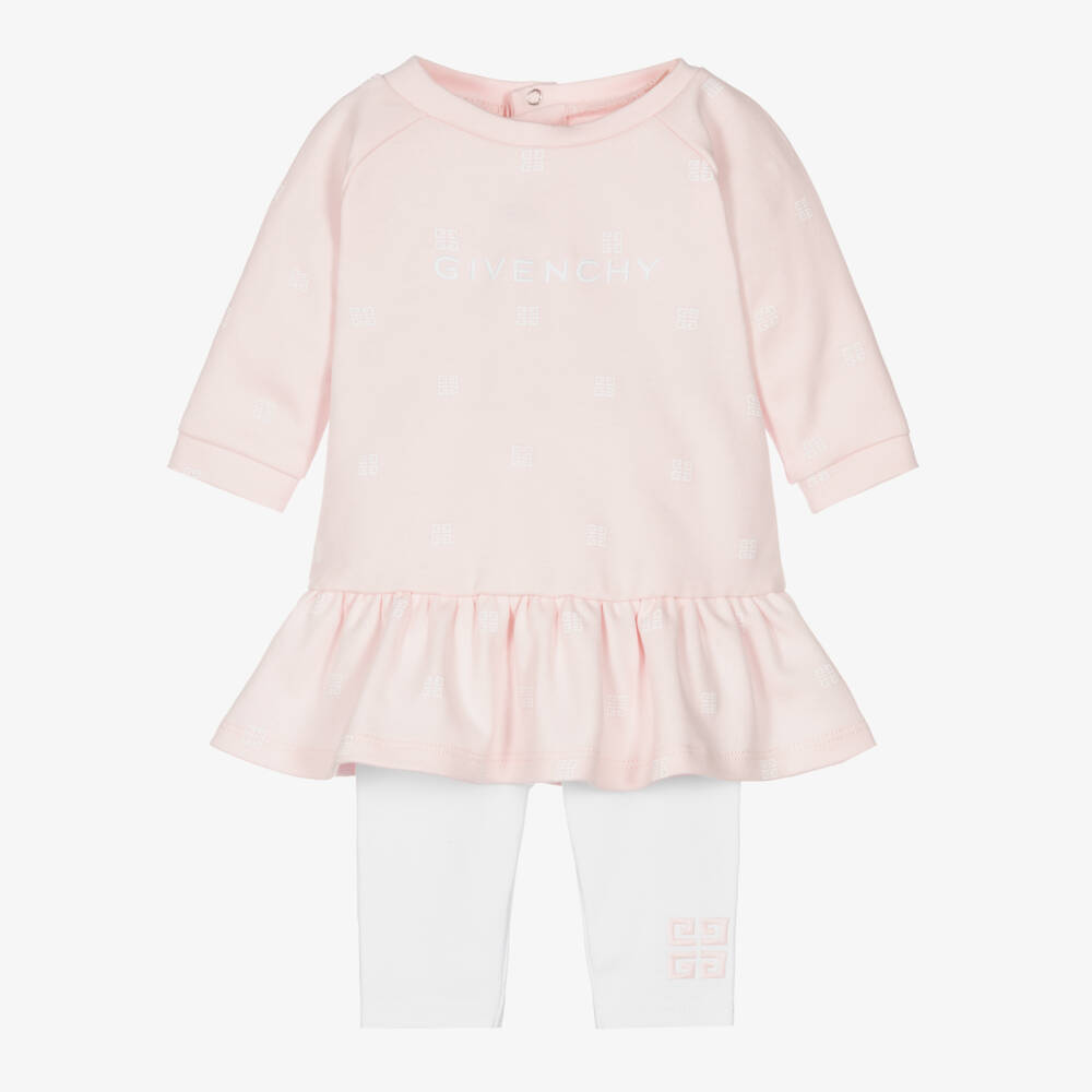 Adorable pale pink dress and leggings set for baby girls by luxury French brand Givenchy, made in soft and stretchy cotton jersey. The pretty dress has a wide gathered hem and is patterned with the signature 4G logo design, with the designer's name embroidered across the front. Popper fastenings on the back help with quick and easy dressing. It comes with cute white leggings that have a gently elasticated waistband for a comfortable fit on little tummies. There is a pink 4G logo appliqué on one leg for a special designer finish. Presented in a branded box, it would make a lovely gift.