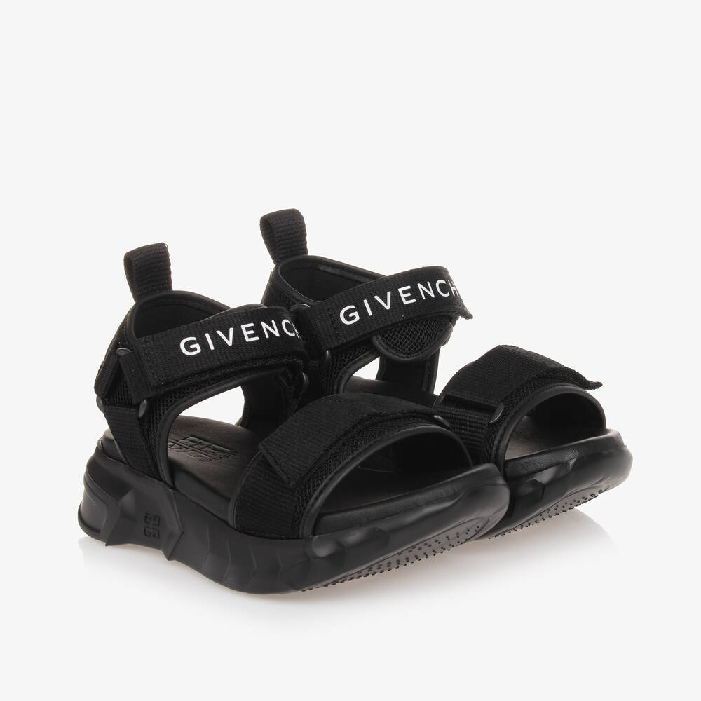 Stylish black sandals for boys and girls by luxury French designer, Givenchy. Set on a chunky rubber outer sole with 4G logo embossing, these contemporary sandals are made in soft textile with velcro straps. They have a padded leather insole for luxurious comfort. A bold white logo can be seen on the front strap and a white 4G logo is stamped on the heel tab, adding those monochromatic details.