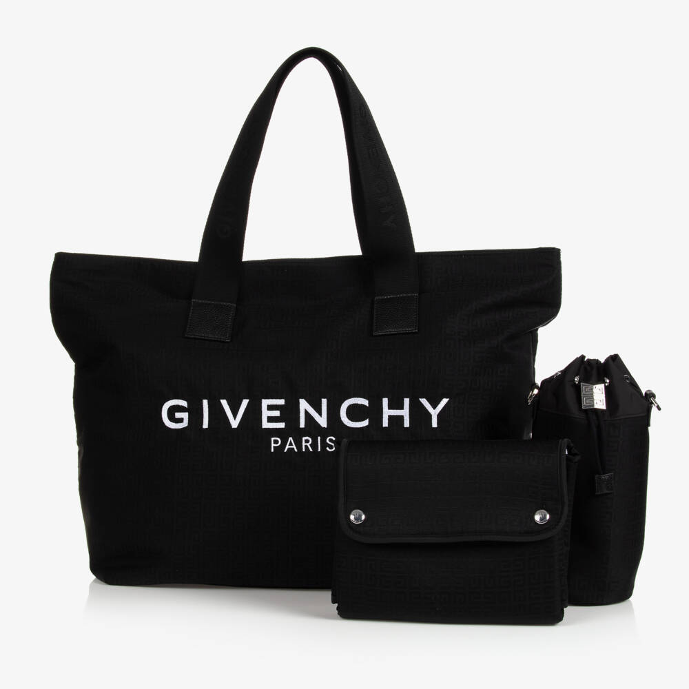 Stylish black tote changing bag by luxury French brand Givenchy, woven in smooth canvas with leather trims. For a distinctive designer look, it has a tonal 4G jacquard logo pattern, logo carry handles, and a white embroidered logo across the front. The main compartment has a silky smooth lining, useful pockets and a branded zip fastening. It comes with a matching foldable changing mat and a thermal bottle holder with branded metal hardware and a detachable leather shoulder strap.