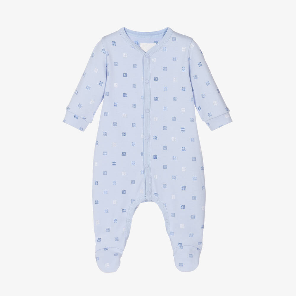 Pale blue babygrow for boys and girls by luxury French brand Givenchy, made in soft cotton jersey for a gentle feel against delicate skin. Patterned with the brand's iconic 4G logos in blue and white, this designer babysuit has an instantly recognisable design. It fastens with poppers on the front and between the legs.