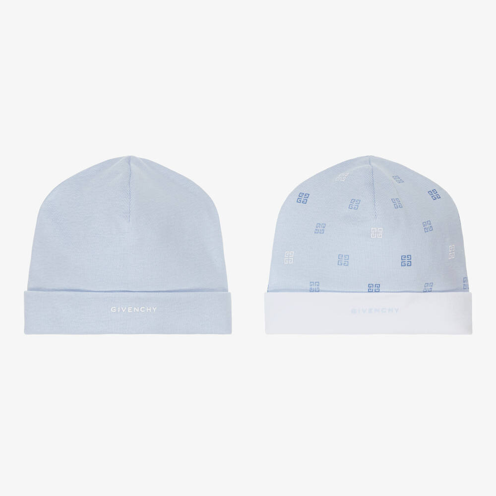 Pack of two blue hats for baby boys and girls by luxury French brand Givenchy. For instant designer appeal, the plain blue hat has a white logo print on the turned-up brim and the other hat is patterned with 4G logos and has a blue spell-out logo on the white turned-up brim. Made in a double layer of soft cotton jersey, the hats will keep baby's head cosy and comfortable.