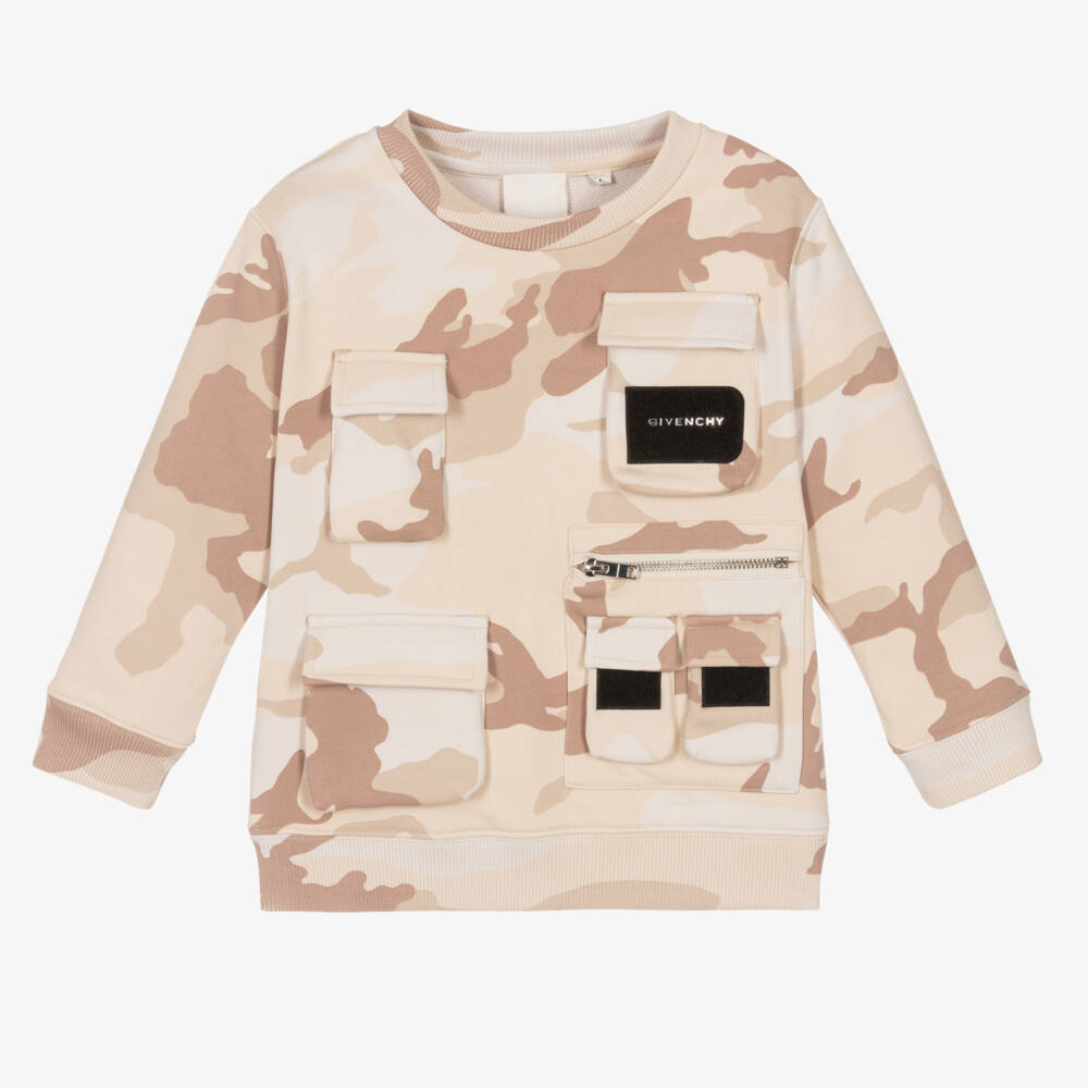 Camouflage-print sweatshirt for boys by luxury label Givenchy, in tones of beige. Made in soft and medium-weight cotton jersey, this classic staple is enhanced by utility pockets with black stand-out velcro and a felted logo patch with silver metal branding. One front pocket fastens with a silver 4G logo-engraved zip for an added designer touch.