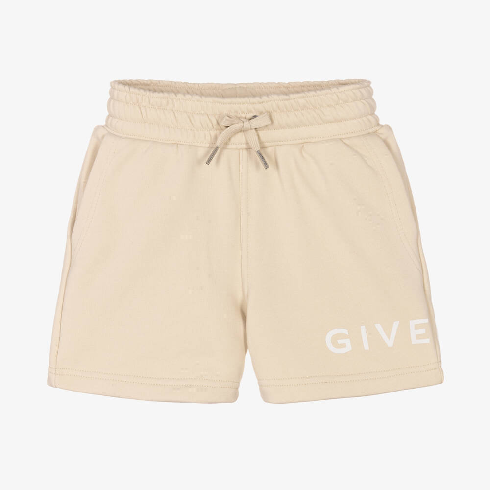 Boys beige cotton Mini-me shorts by luxury French brand Givenchy, made in comfortable mid-weight jersey. Simply styled, they have a large white wrap-around logo print on one leg and a 4G logo on the back. The elasticated waist is super comfortable and can be adjusted with a drawstring.