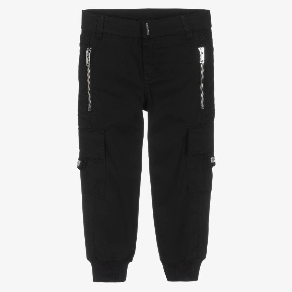Black cargo trousers for boys by luxury brand Givenchy. They are made in soft and durable cotton gaberdine with slight stretch for freer movement. These cuffed trousers have front pockets with logo-engraved zip pulls, popper-fastening utility pockets and jetted pockets on the back. 4G metal rivets, a silver logo plate on the front and leather branded patch on the back waist add distinctive designer details.