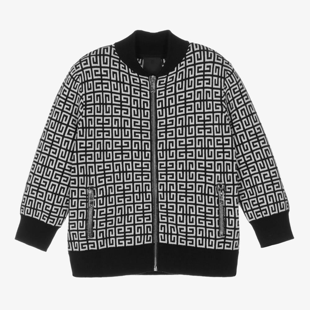 Black and white knitted Givenchy zip-up top for boys, knitted from soft cotton. Lovely and luxurious, this Mini-me style is boldly emblazoned with an intricately woven 4G logo pattern, with the brand's intarsia logo in bold white across the back hemline. It is finished with contrast black trims and zipped front pockets, ideal for keeping belongings safe.