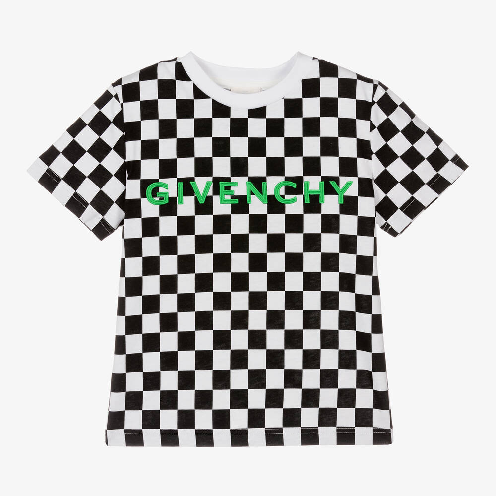 Cool black and white checkerboard patterned T-shirt for boys from luxury brand Givenchy, made in soft cotton jersey. It has a contrast green embroidered branding on the front and the iconic 4G logo appliquéd on the back for a statement look. In a streetwear-inspired look, this crew neck tee is comfortable for everyday casual with short sleeves.