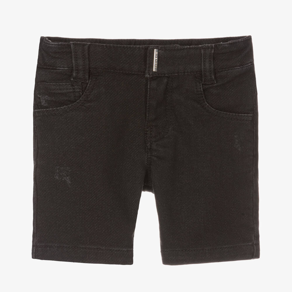 Black shorts for little boys by luxury French brand Givenchy. Made in a soft and stretchy cotton blend, they have the look of denim but the feel of jersey. With classic five pocket styling, they have stylish distressed patches on the front and back. The waistband is adjustable and has a black and white jacquard logo across the back. There are silver metal 4G logo rivets on the back and a silver metal logo plate on the front. These comfortable shorts fasten with a popper and zip.