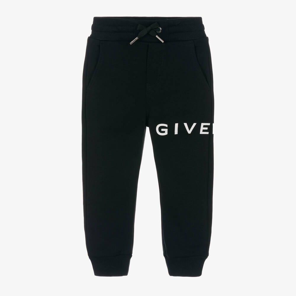 Comfortable black cotton Mini-me joggers for boys by French luxury brand Givenchy, made in mid-weight jersey. There are handy pockets on the front and back, as well as an elasticated drawstring waist for a good fit. They have a large white wrap-around logo print on one leg and the iconic 4G logo on the back.