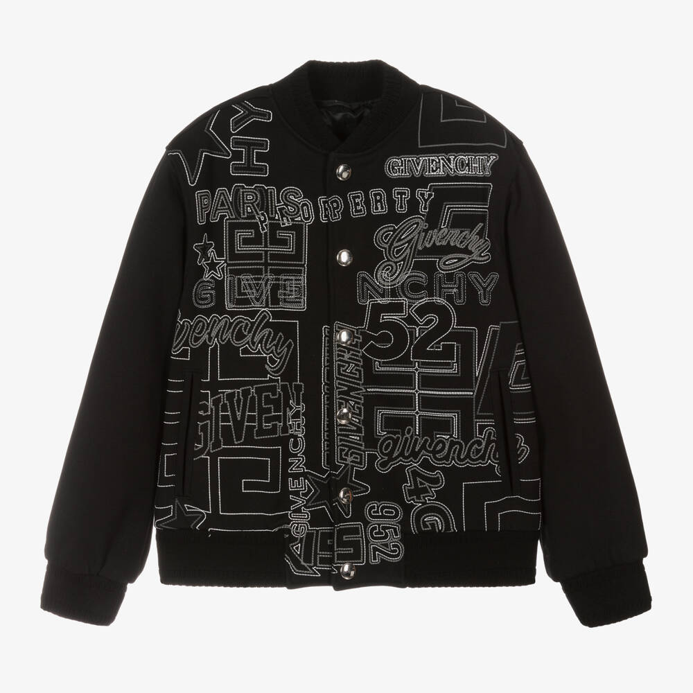 A cool and casual black bomber jacket for older boys by luxury French brand Givenchy, made in mid-weight cotton jersey. As seen in the main collection, this modern varsity-style jacket is intricately embroidered on both the front and back with iconic 4G and Givenchy logos in grey and white. For ultimate comfort, it has knitted ribbed trims, a silky soft 4G jacquard lining and pockets on the front. Shiny branded silver popper fastenings add a stylish finishing touch.