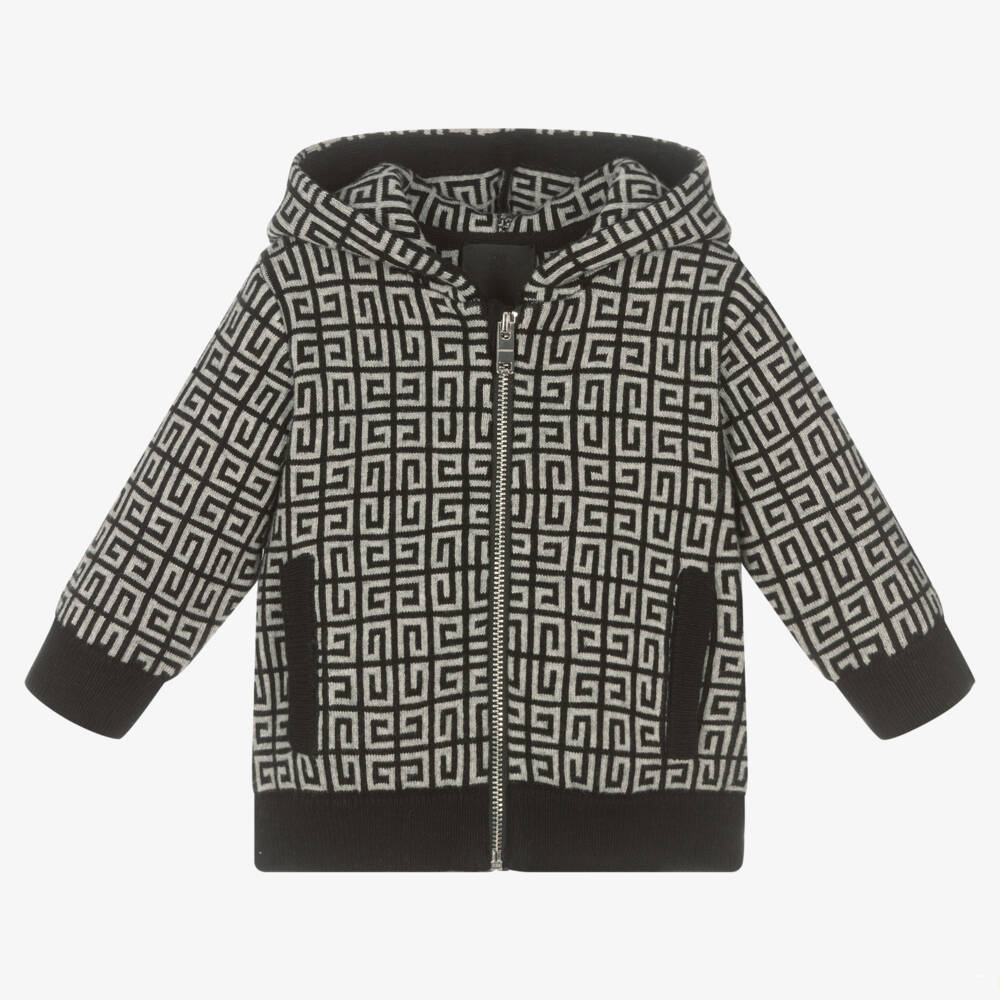 Black and grey hooded zip-up top for little boys by luxury French brand Givenchy. Made in a super soft blend of cotton and cashmere, it has an all over 4G logo pattern. There are ribbed trims and front pockets. There is a black and grey logo on the back and it fastens with a shiny silver zip.