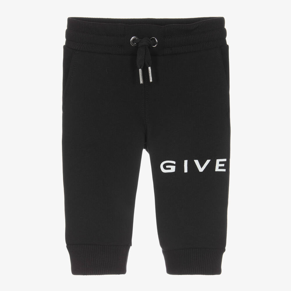 Little boys black joggers by luxury brand, Givenchy. Made in mid-weight cotton sweatshirt jersey, they have a white logo print on the legs and an adjustable waistband. They have side pockets and one on the back, with a 4G logo print underneath.