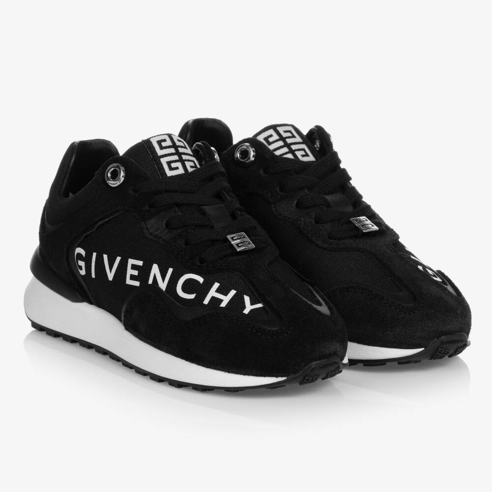Black mini-me trainers for boys by luxury designer Givenchy, crafted in soft suede leather. Inspired by the brand's iconic logos, they have the signature 4G logo embroidered in white on the tongue and a spell-out logo printed on the sides. The minimalist black laces have a shiny silver 4G logo charm on the front for extra designer appeal. For an on-trend look, they have chunky black and white rubber outer soles that are embossed with the 4G logo for a luxurious, yet practical finish. Promising comfort, they have a smooth leather lining and padded leather insole.