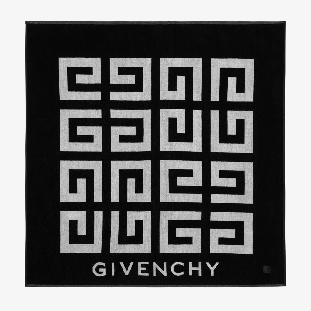 Mini-me square black towel for boys by luxury French brand Givenchy. Made in luxuriously soft cotton velour, it has a large white 4G logo pattern on the front with a white logo below. The reverse is made in soft and absorbent cotton towelling. This eye-catching towel is ideal for the beach and bath.