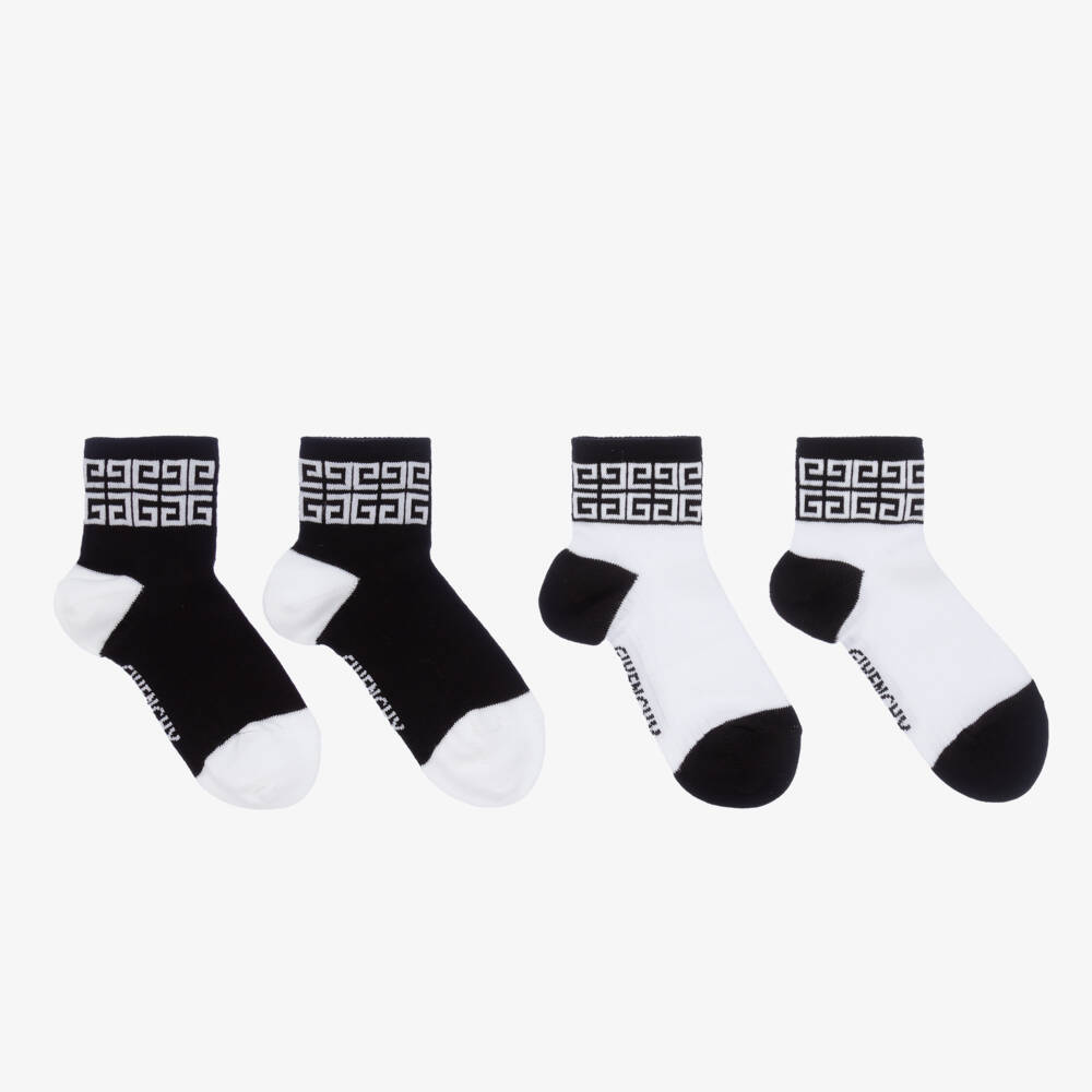 Cool pack of two black and white socks for boys, by luxury French designer Givenchy. Knitted in a soft cotton blend, each pair of ankle-length styles have a knitted 4G logo band around the ankle. Accessorize smart and casual looks alike with these logo-inspired socks, featuring the brand's iconic spell-out logo underneath each foot.