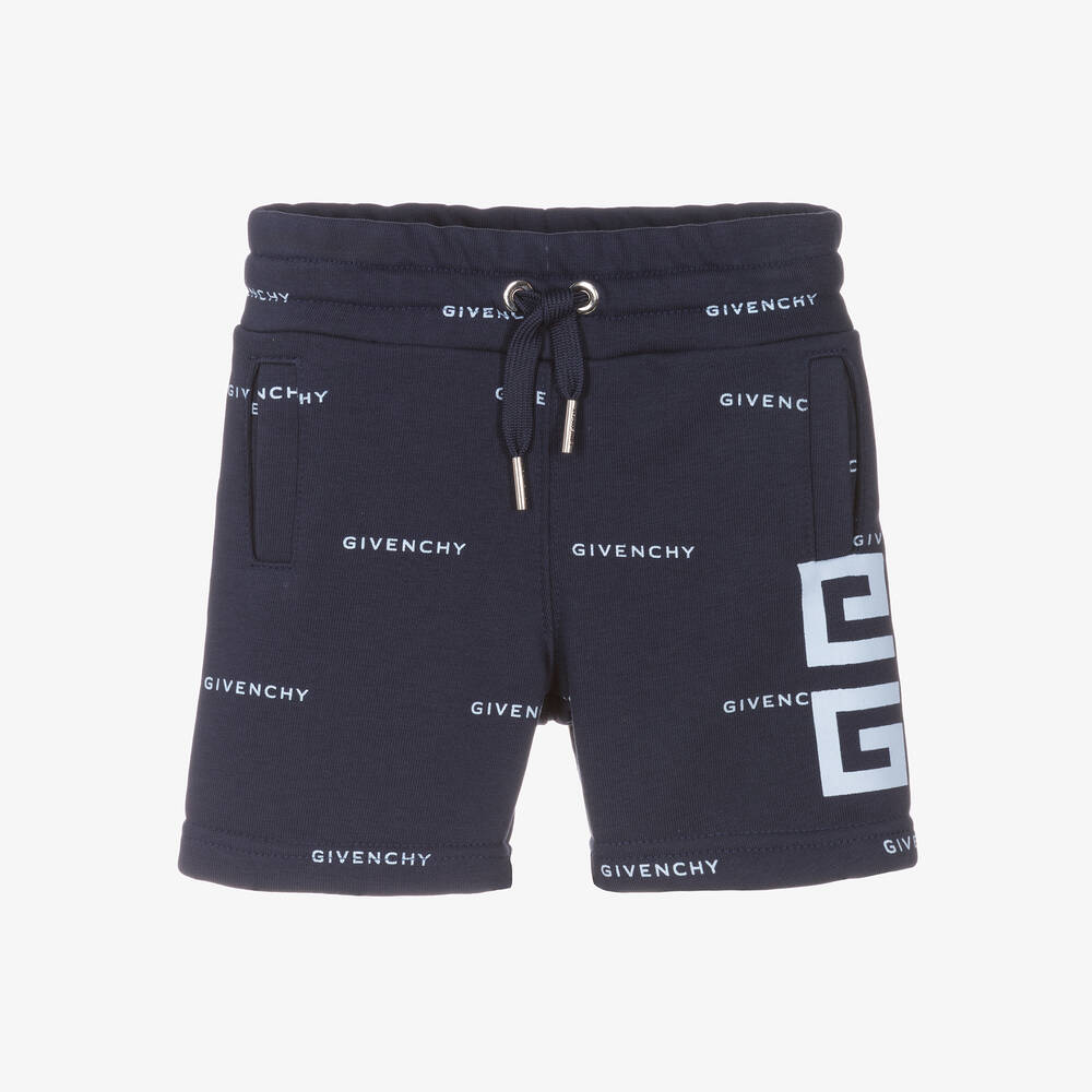 Navy blue shorts for little boys by luxury French brand Givenchy, made in soft, mid-weight cotton jersey. They are patterned with pale blue logos and have the brand's iconic 4G logo printed on one side. Casual and easy wearing, they have front and back pockets and a useful drawstring waist for a comfortable fit.