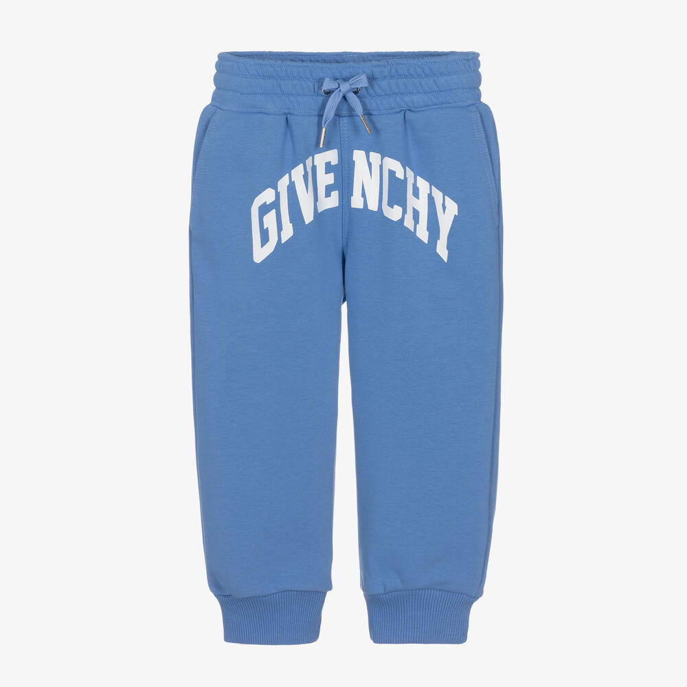 Sporty blue Mini-me cotton joggers for boys, unmistakably by luxury French designer Givenchy, with a varsity style logo printed across the front in white. They are made in stretchy sweatshirt jersey for comfort and have an elasticated, drawstring waist for a great fit, and neat, ribbed cuffs. There are useful, slanted front pockets as well as a back pocket, embroidered with the brand's iconic 4G logo in white.