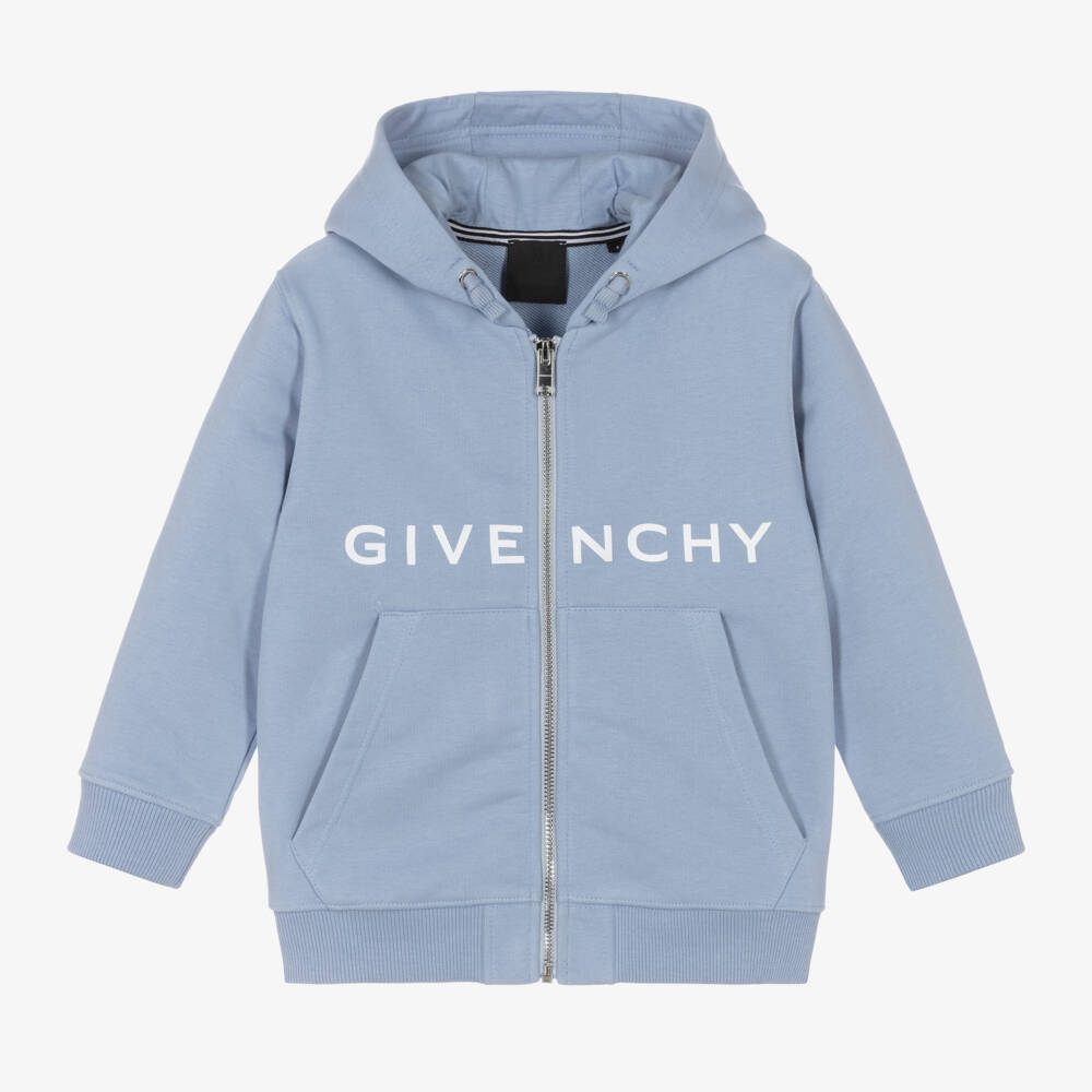 Super cool and understated blue zip-up Mini-me hoodie for boys from French luxury brand Givenchy, made in mid-weight cotton jersey. Fastening with a subtle logo zip, the centre piece of this top is the white logo lettering on the front and iconic 4G on the back. There are faux drawstring details on the hood and useful front pockets, for keeping small hands warm.