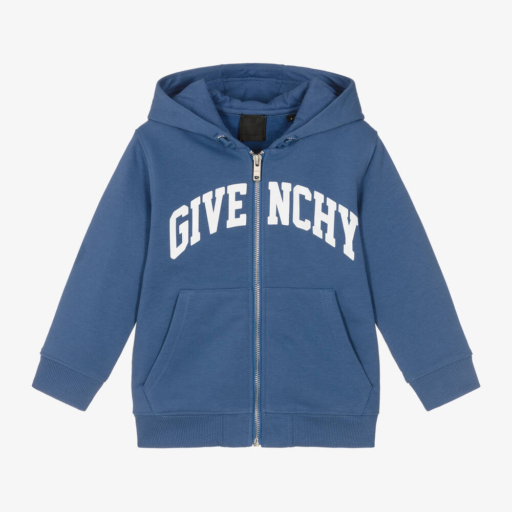 Sporty blue, hooded zip-up top for boys by luxury French designer Givenchy, with a white varsity-style logo printed across the chest. Made in comfortable cotton jersey with a soft fleecy feel inside, it has a faux drawstring on the hood, casual ribbed trims and front pouch pockets. For added designer detail, the zip fastens with a branded pull and a small 4G logo is printed on the back.