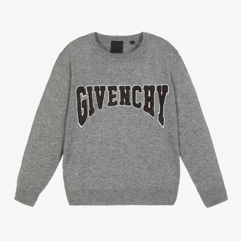A grey marl Mini-me sweater for boys from luxury French brand Givenchy, knitted in a soft wool and cashmere blend. Great for making a designer statement, it has a dark grey and white bouclé logo appliqué on the front.