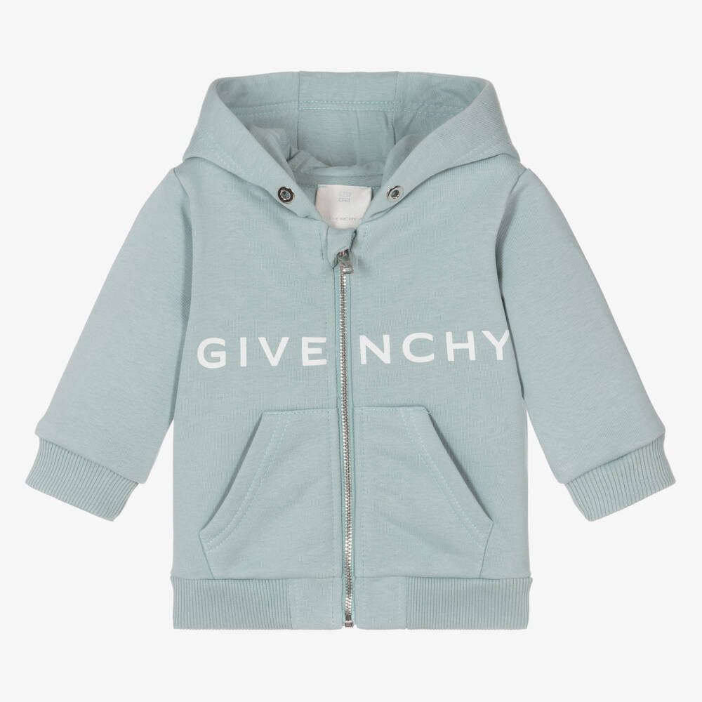 Sage green hooded zip-up top for little boys by luxury French brand Givenchy. It has a bold white logo printed on the front and a large white 4G logo printed on the back for instant designer recognition. Ideal for relaxing in style, it is made in soft, mid-weight cotton jersey with a warm, fleecy inside, cosy, ribbed trims and useful pouch pockets. It fastens with a shiny silver zip that has a protective chin guard and a logo pull tab.