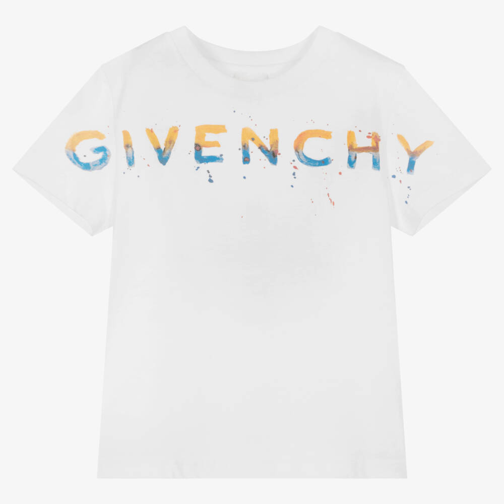 Casual white T-shirt for boys by luxury French brand Givenchy, with a colourful paint-effect logo print across the front. This classic style has a ribbed crew neckline and is made in comfortable cotton jersey.