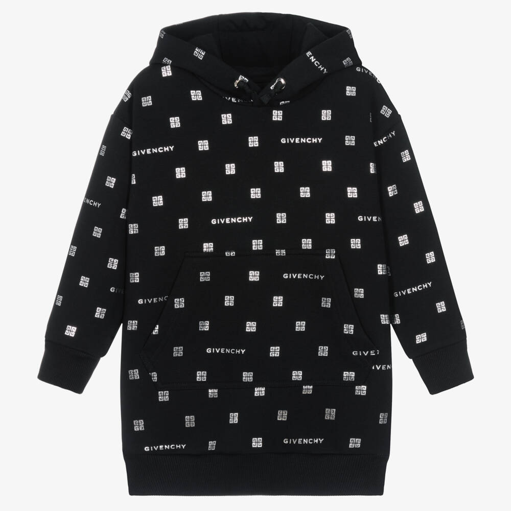 Casual yet stylish, this black hooded sweatshirt dress for girls is from luxury French designer, Givenchy. Made in comfortable cotton jersey with gently ribbed trims, it is patterned with shiny silver signature logos and 4G logos for instant designer appeal. Faux drawstring detail on the hood and a pouch pocket on the front complete the relaxed look.
