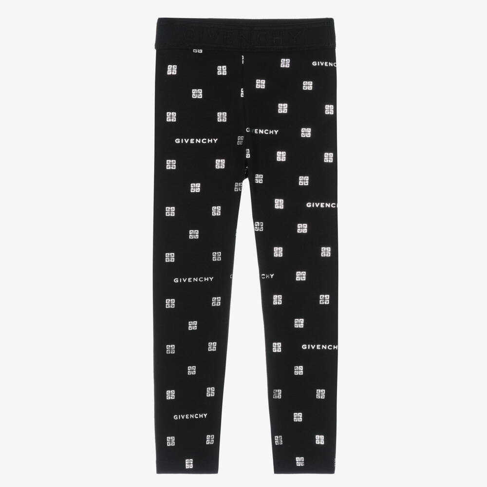 Black cotton leggings for girls by luxury French designer Givenchy, made in soft and stretchy cotton jersey. Instantly recognisable, they are patterned with shiny silver signature and 4G logos. Completing the look is a comfortable elasticated jacquard logo waistband.