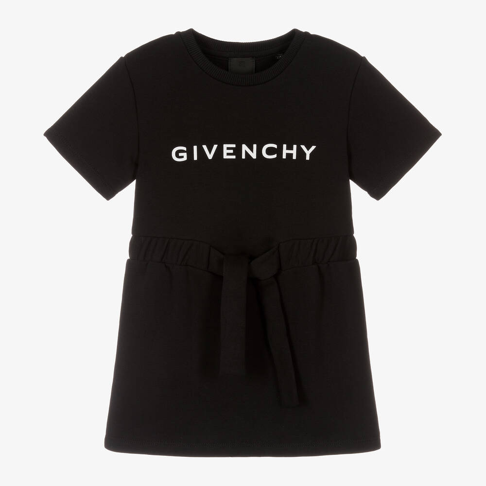Mini-me black dress for girls by luxury brand Givenchy, made in soft mid-weight cotton jersey. A design seen in the adult collection, it has a bold white logo print on the front and the iconic 4G motif on the back. Balancing cool and casual, it has a ribbed crew neck and an elasticated waistband. A bow can be tied on the front, adding a feminine detail.