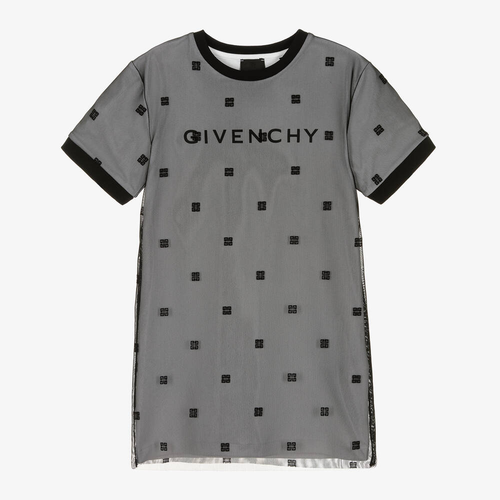 Mini-me, black mesh and white cotton jersey dress for girls by luxury French label, Givenchy. The white jersey layer provides comfortable, easy-to-wear style, simply slipping over the head. The attached, soft mesh overlay has a flocked 4G pattern for instant designer appeal.
