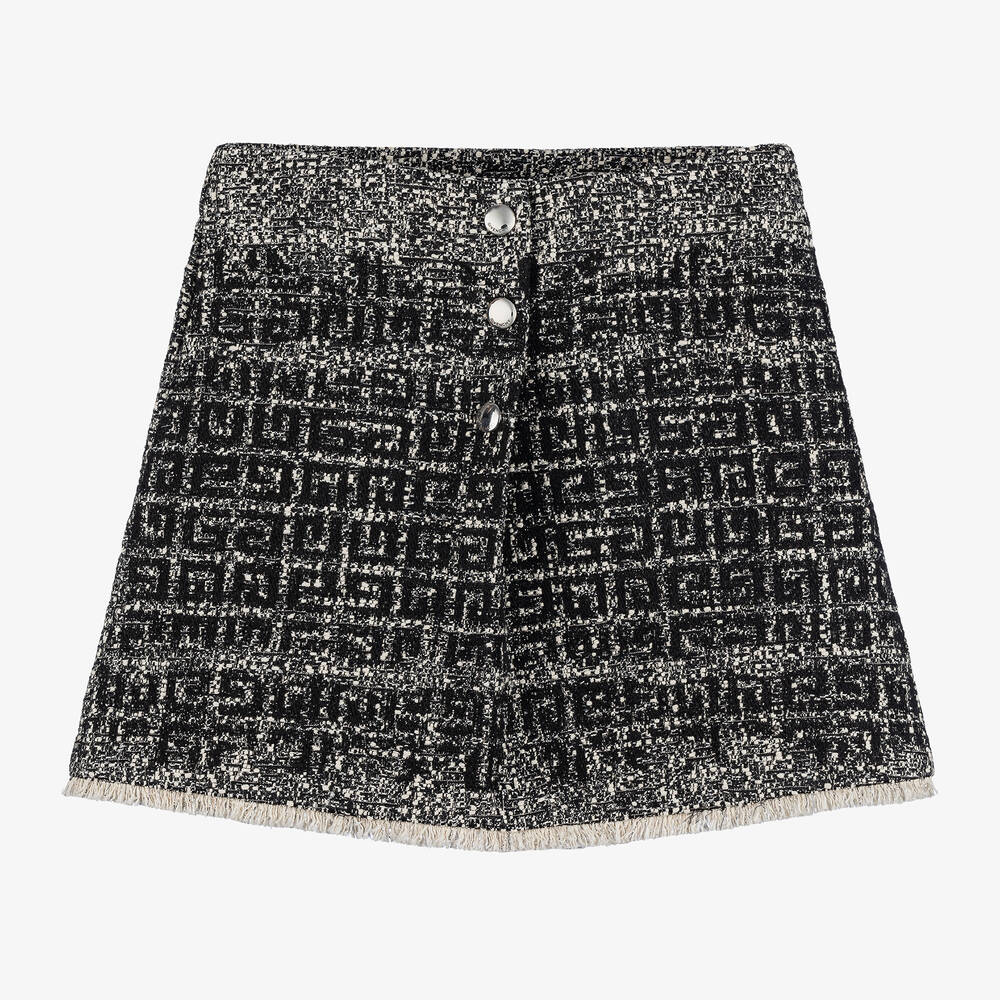 A stylish tweed skort for girls by luxury French brand Givenchy, in black and ivory with a subtle, silver glitter sparkle. Made with cotton, this smart design has an embroidered black 4G logo pattern on the front with a pleat detail. Branded silver studs and fringing on the hem complete the look. It has a silver zip fastening on one side and an adjustable waistband for a great fit.