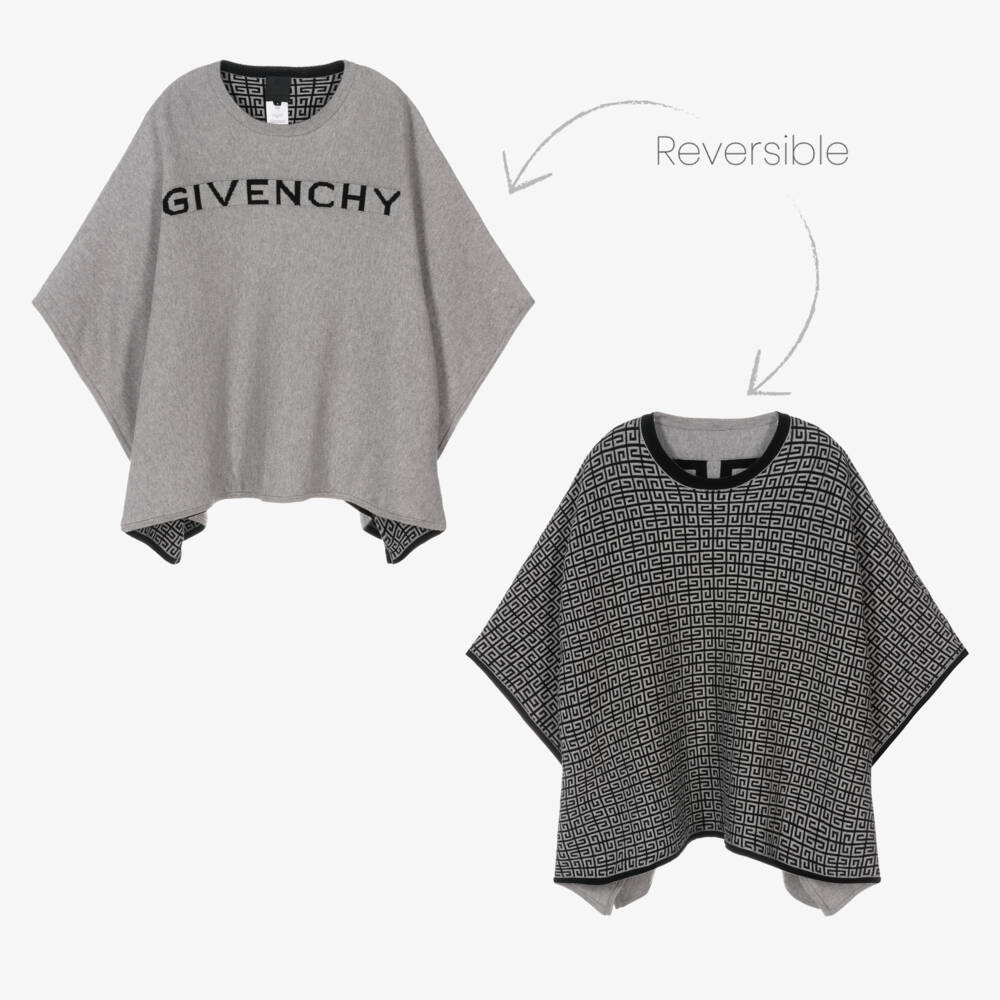 Grey marl cape for girls by luxury French brand Givenchy, made in a soft, mid-weight cotton knit with a hint of cashmere. For two looks in one, this reversible design features a black intarsia logo on the front with a large 4G motif on the back. The reverse is patterned with black 4G logos for alternative styling. It has a ribbed neckline and simply slips on over the head for cosy coverage.