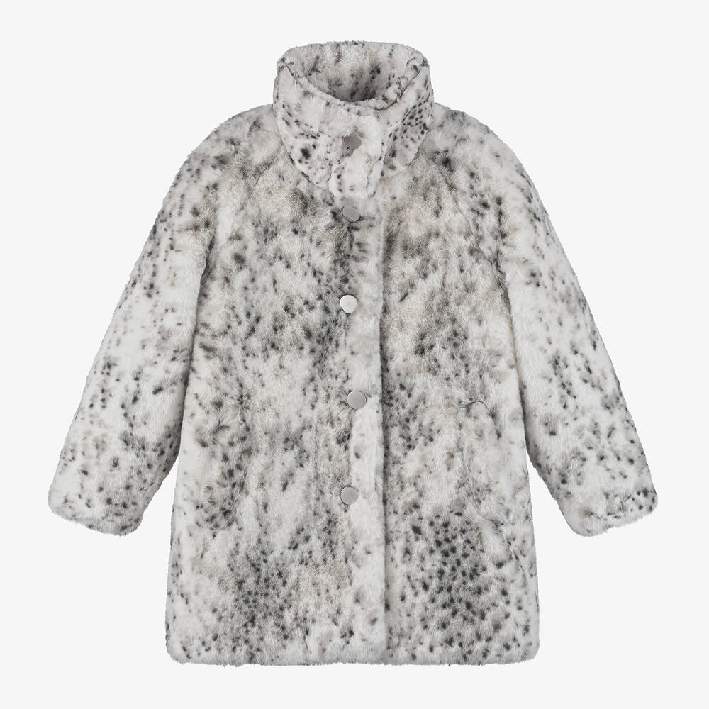 Inspired by Givenchy's main collection, this ivory faux fur coat for girls is patterned in a beautiful grey ocelot print. It is luxuriously soft and cosy, with a high collar and fleece-lined pockets. Adding the all-important designer details, the black satin lining has a 4G pattern and the brand's logo can be seen across the back in black faux leather appliqués. The coat fastens easily with poppers and has decorative silver-tone buttons with embossed logos around the edge.