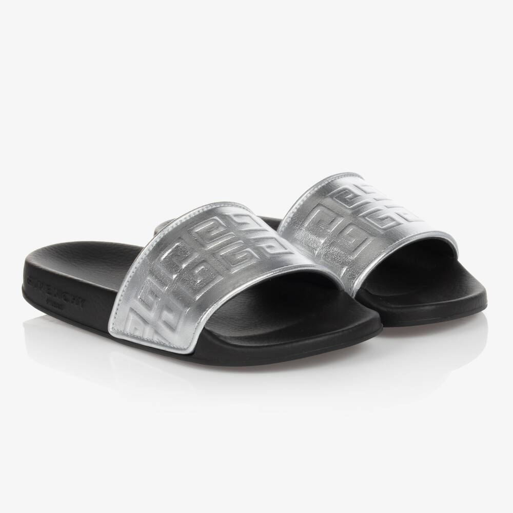 Girls metallic silver sliders by luxury Italian designer Givenchy, embossed with the brand's iconic 4G logo. In an easy slip-on style, these luxe sliders have a moulded footbed for stylish comfort.