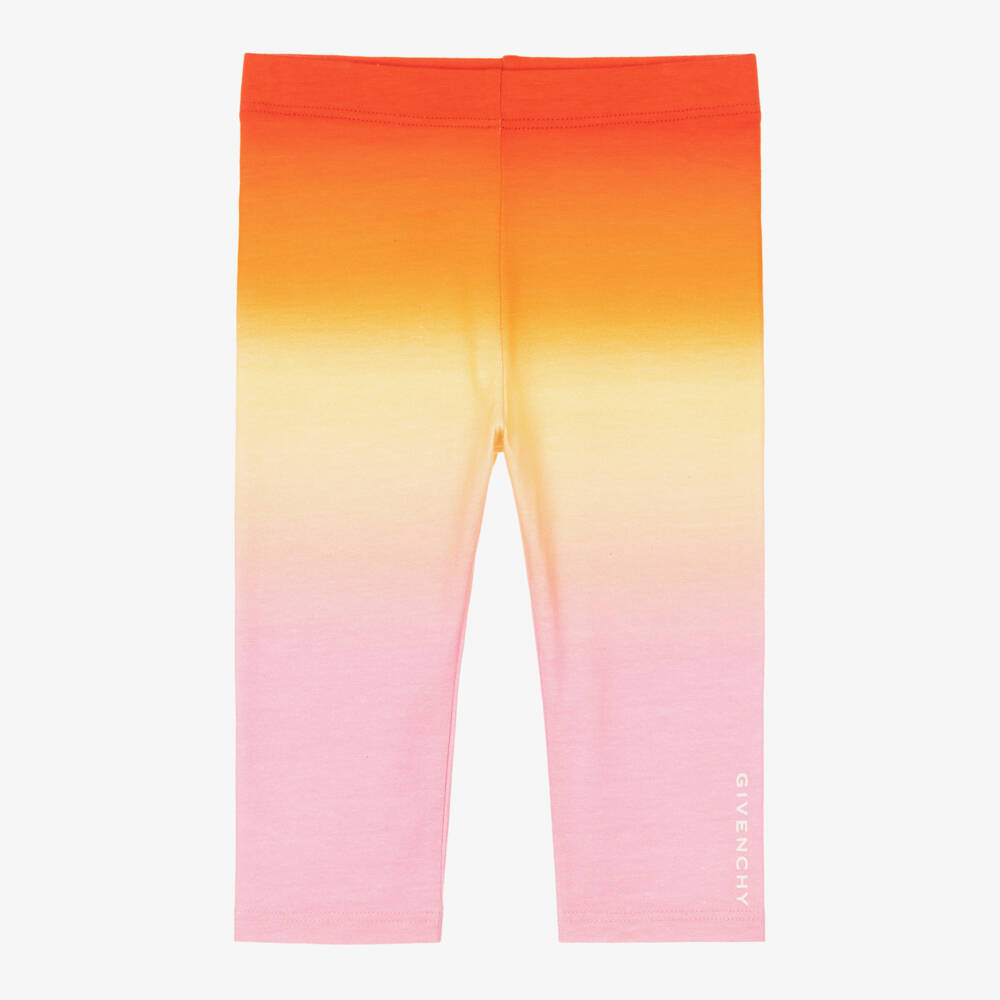 Little girls ombré shaded leggings by Givenchy. In shades of orange, yellow and pink, these colourful leggings are made in soft and stretchy cotton jersey and have a comfortable elasticated waistband.