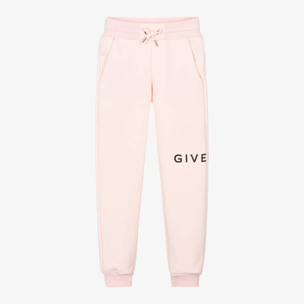 Pale pink Mini-me joggers for girls by luxury brand Givenchy, made in a mid-weight cotton blend with a soft fleecy inside. For a signature look, these jersey trousers have black logo lettering on one leg and an iconic 4G logo on the back. They have stretchy ribbed cuffs and a drawstring waistband to adjust the fit. Slanted front pockets are handy for carrying small belongings.