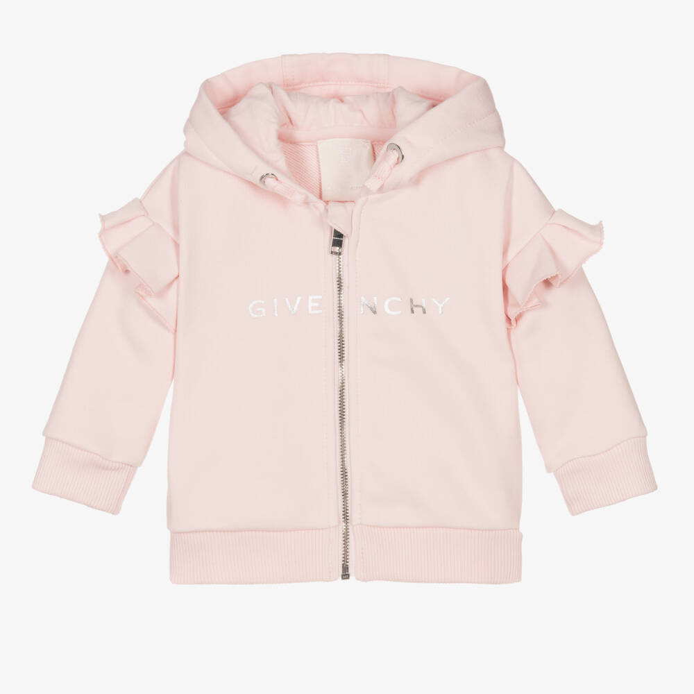 Light pink zip-up hoodie for little girls from luxury label Givenchy. Shimmering in silver, the French designer's foil logo lettering is stamped across the front, with their signature 4G logo print on the back. It is made in stretchy sweatshirt jersey, with sweet ruffle details on the shoulders. The silver hardware on the front zip is engraved with branding for an extra designer touch. A softly ribbed hem and cuffs ensure it is as comfortable as it is stylish.
