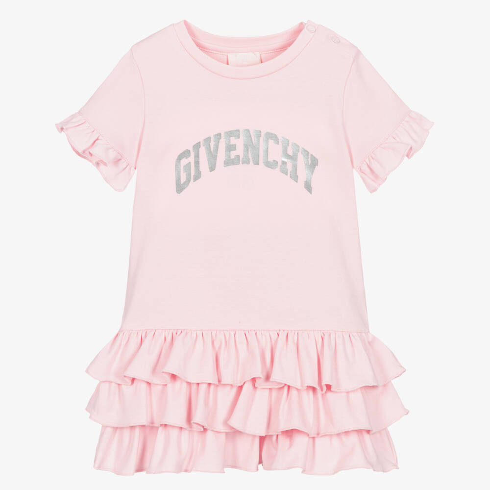 Pastel pink T-shirt dress for little girls from luxury French brand Givenchy, made in soft and comfortable cotton jersey. Easy-to-wear, this cute dress has a silver logo printed across the front for instant designer appeal. Pretty ruffles on the sleeves and skirt give an elevated finish to this casual style.