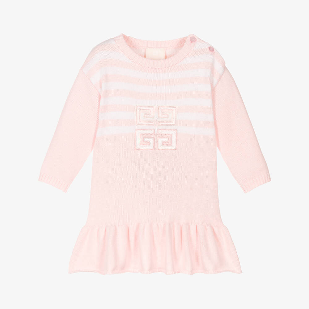 Cute pink dress for little girls by French designer Givenchy, knitted in super soft cotton with a touch of cashmere for added warmth and luxury. The top of the dress has a pink and white striped pattern and there is a satin and embroidered 4G logo on the front. This cosy dress has a ruffle hem, ribbed trims and branded button fastenings on one shoulder.